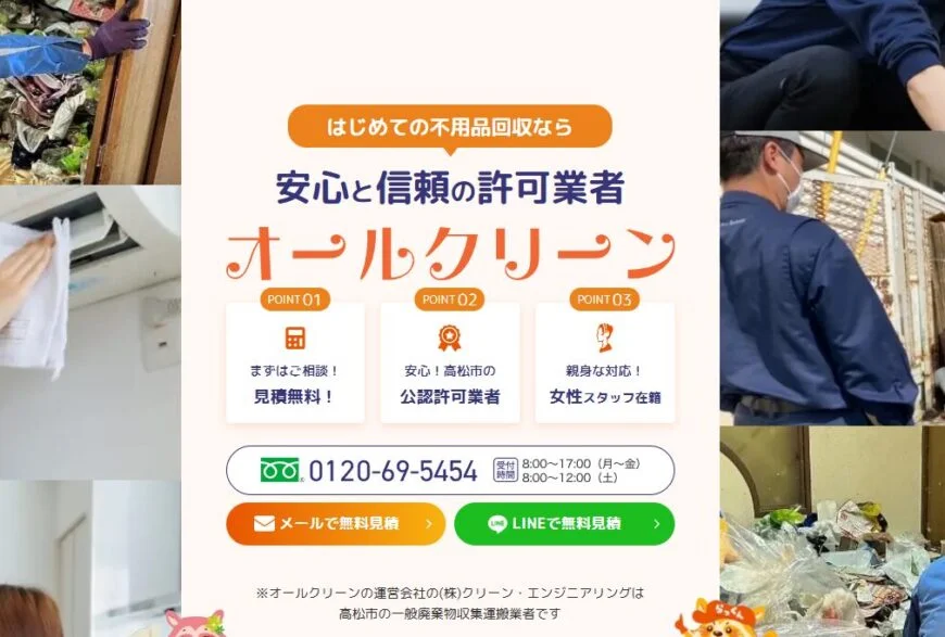 高松市の不用品回収・粗大ごみ処分ならオールクリーンにお任せください。不用品回収、遺品整理・生前整理、ゴミ屋敷の片付け、家具の移動、木の伐採・剪定、草刈り・草抜き、家事代行、買い物代行、ハウスクリーニングなどの幅広いサービスに対応。高松市で不用品回収・粗大ごみ処分にお困りの際はオールクリーンへご相談ください。